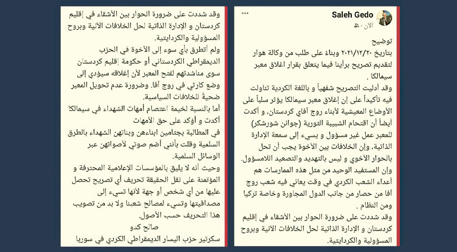 سالح گهدۆ ژ ئاژانسا ئانهایێ خواست داخویانییا وی سهرهراست بكهن، ئیرۆ رۆژا سێشهمبێ ژی 21/12/2021ێ زهلالكرنهك ل حهسابا خوه یا مهدیایا جڤاكی بهلاڤ كر و تێدا گۆتییه: «ل سهر داخوازا ئاژانسا ئانهایێ، ل رۆژا 20/12/2021ێ، من داخویانی دایه وێ ئاژانسێ و من نرخاندن ژ بۆ گرتنا دهریێ سێمالكایێ كر، من گۆت ئهڤ یێك ب زیانا گهلێ رۆژئاڤا دهێت، ژبهر كو رۆژئاڤا دبن دۆرپێچا دهولهتێن ههرێمی دا یه ب تایبهت تركیهیێ».